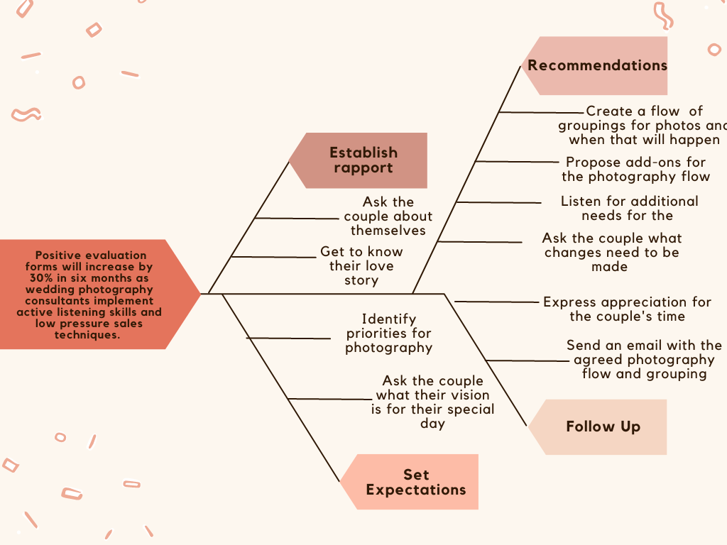 Drawing from Smith & Ragan’s analysis method and leveraging my own experiences as a wedding photography consultant, I stepped into the role of subject matter expert (SME). With a clear goal in mind, I applied backward design principles to develop precise learning objectives that would guide learners to success.